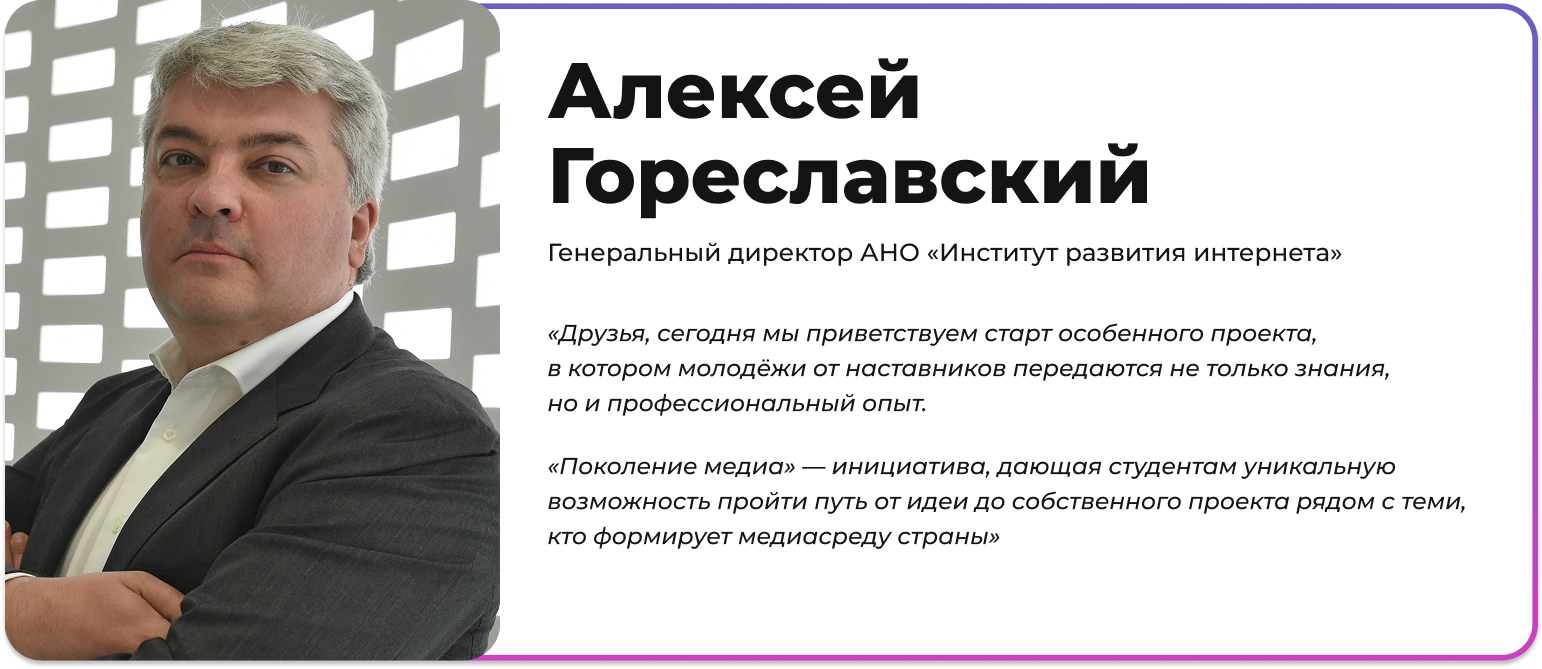 Участие в Проекте «Поколение медиа» могут принять студенты бакалавриата, специалитета, магистратуры всех форм обучения, являющиеся гражданами Российской Федерации или находящиеся в процессе получения гражданства.